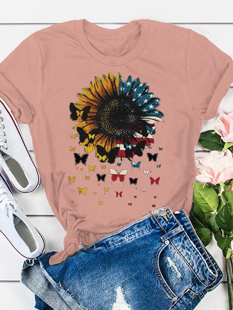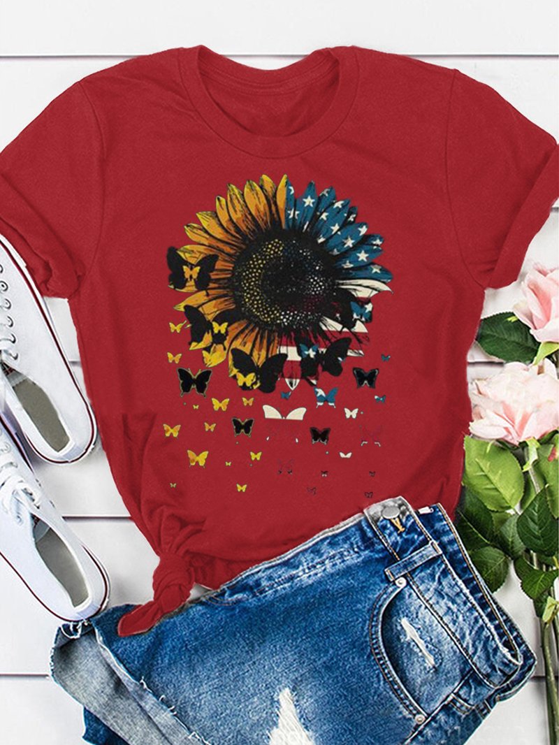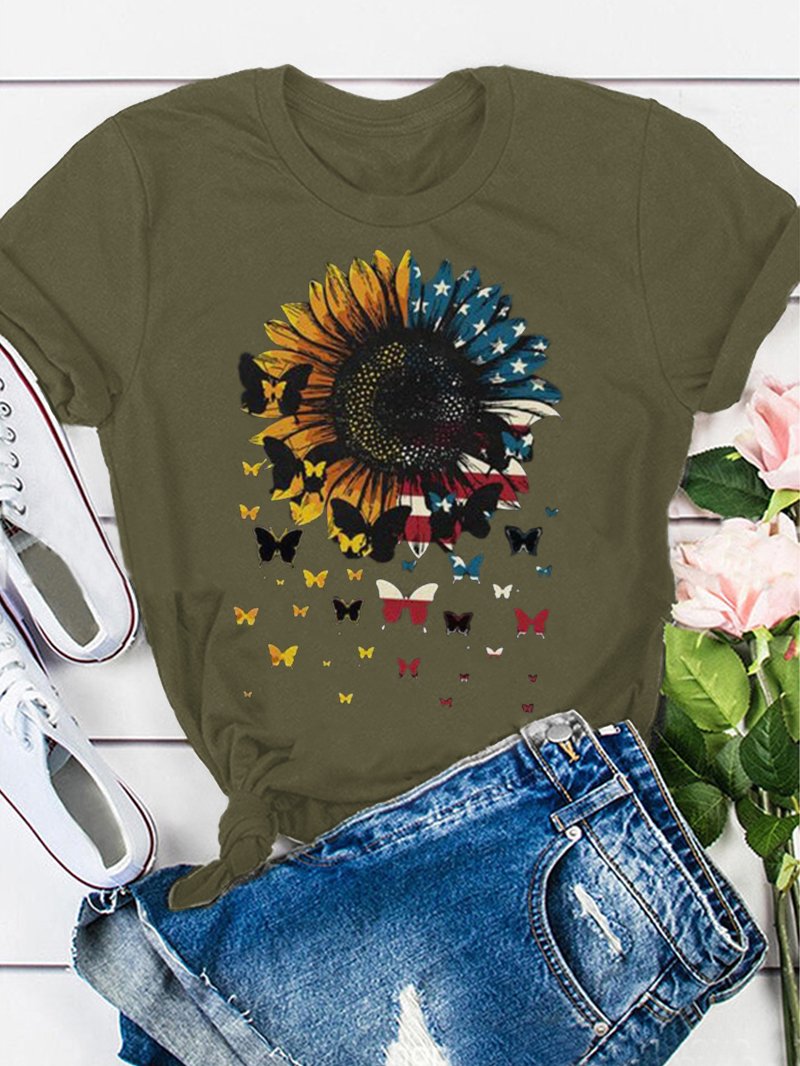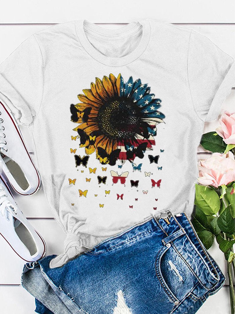 Sunflower Butterfly Star Stripe Print Round Neck Short Sleeve T-Shirt