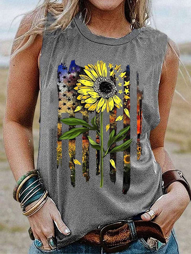 Sunflower Star Print Round Neck Sleeveless Loose Tank Top