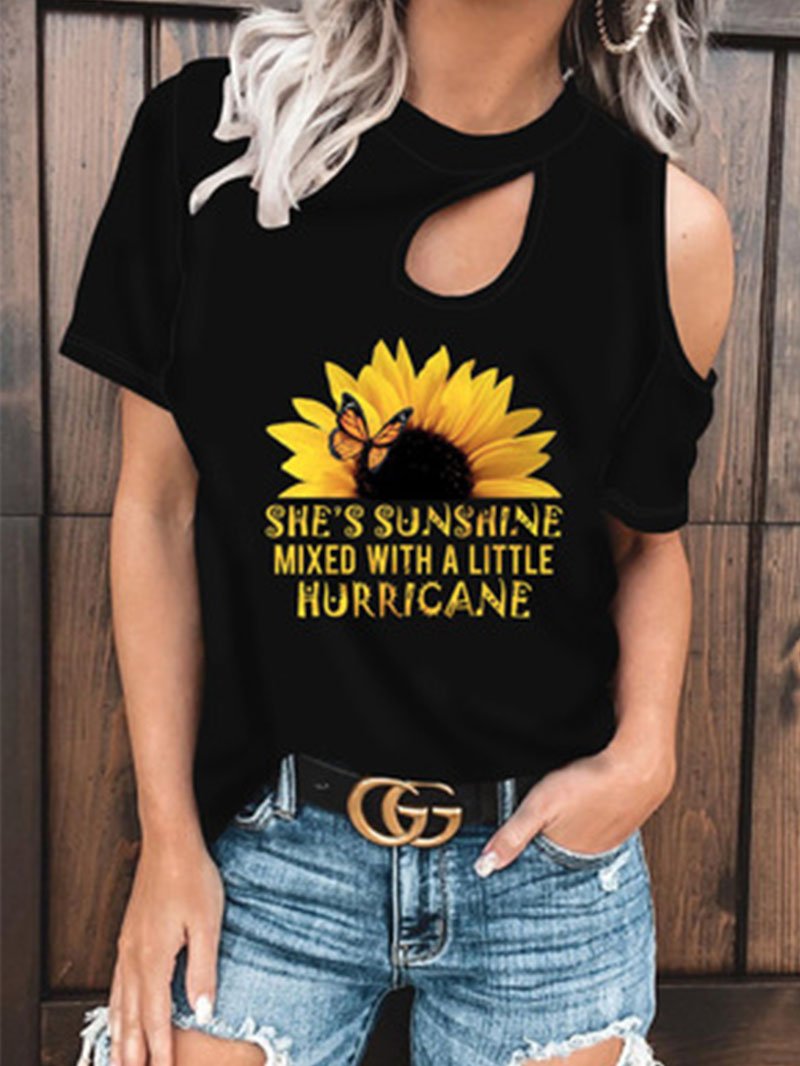 Sunflower be kind printed off-the-shoulder tear-through women's T-shirt