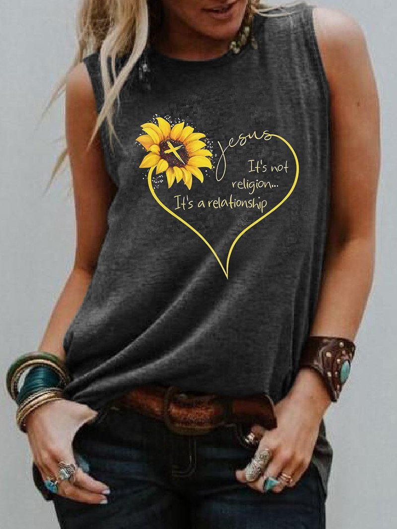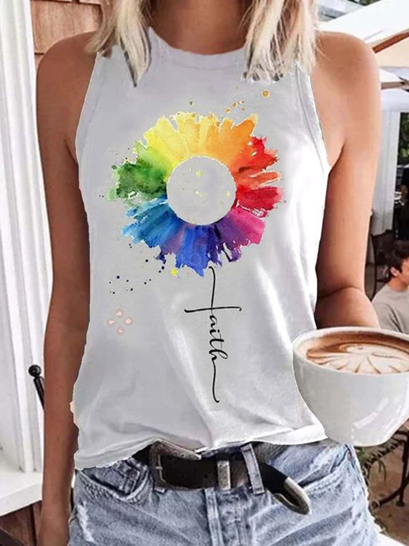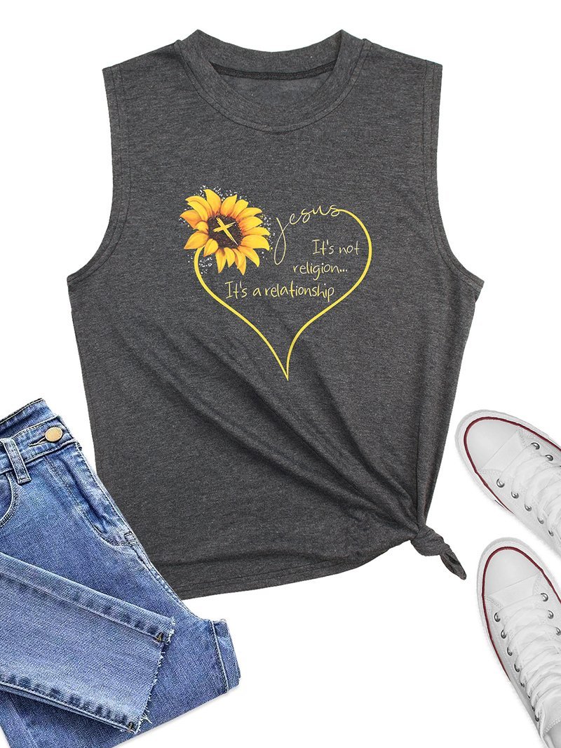 Sunflower Star Print Round Neck Sleeveless Loose Tank Top