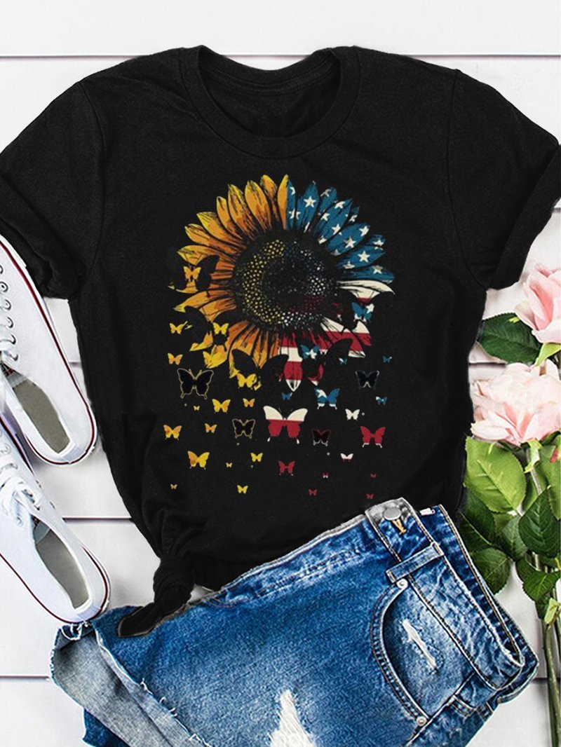 Sunflower Butterfly Star Stripe Print Round Neck Short Sleeve T-Shirt