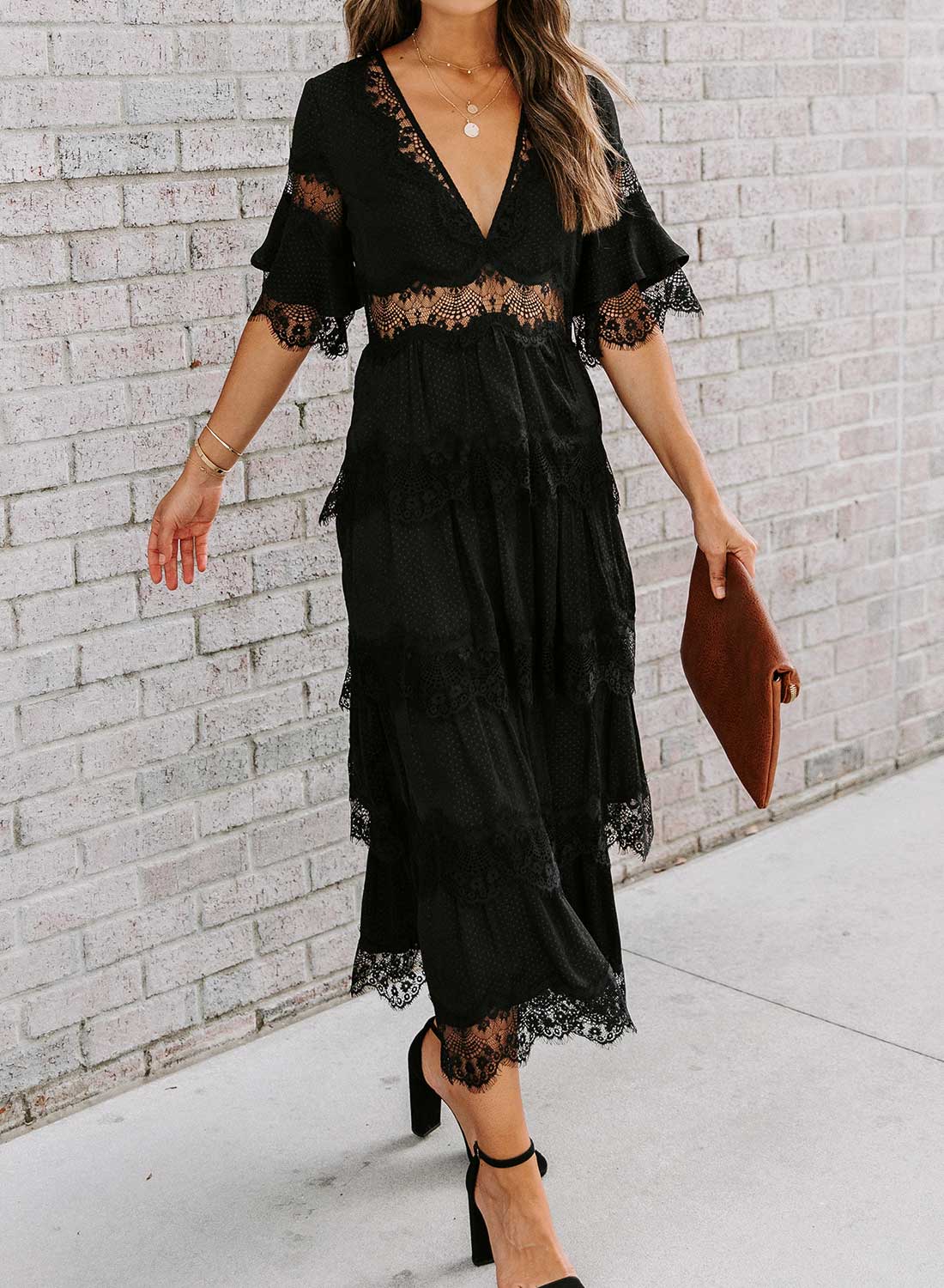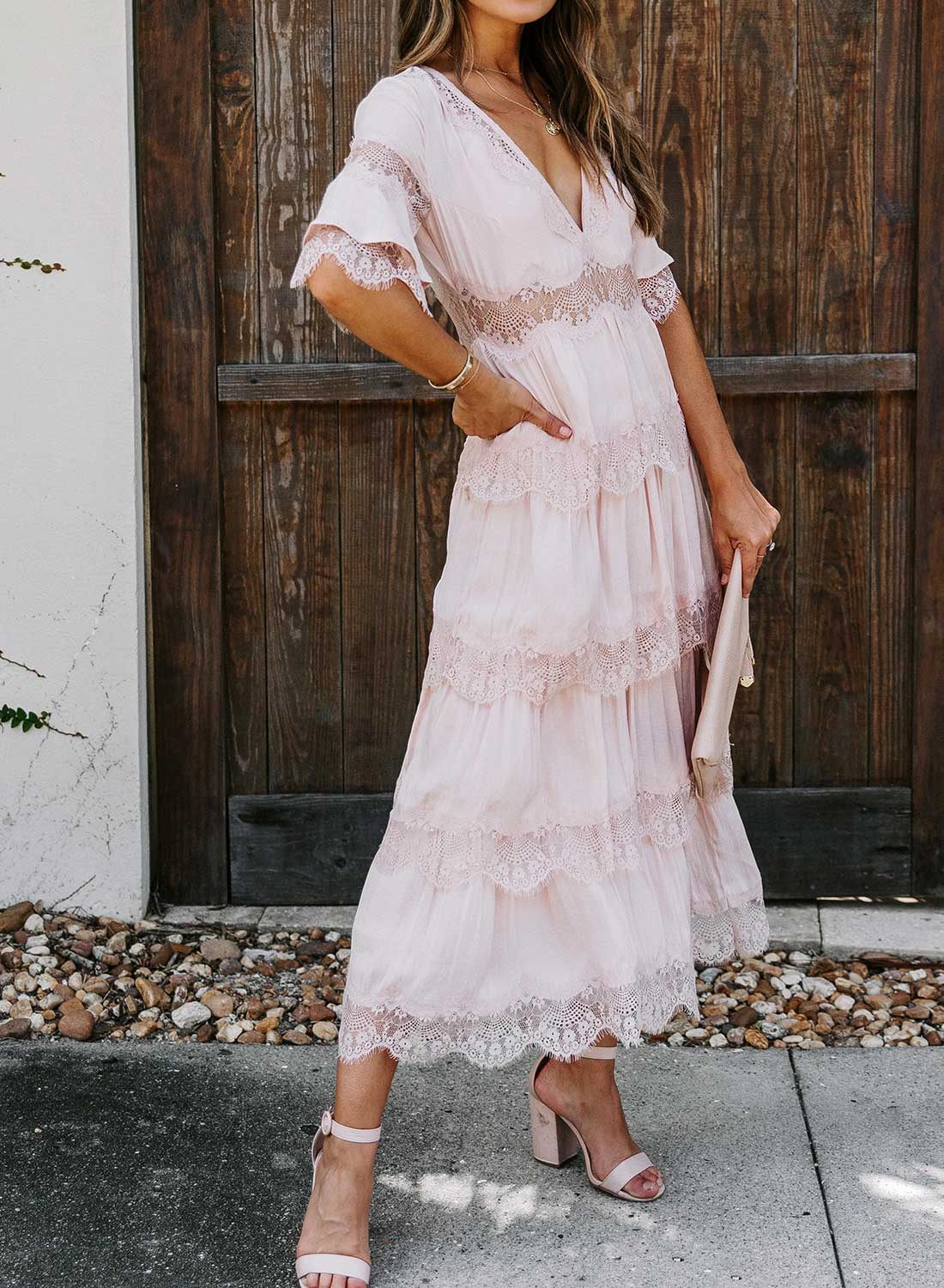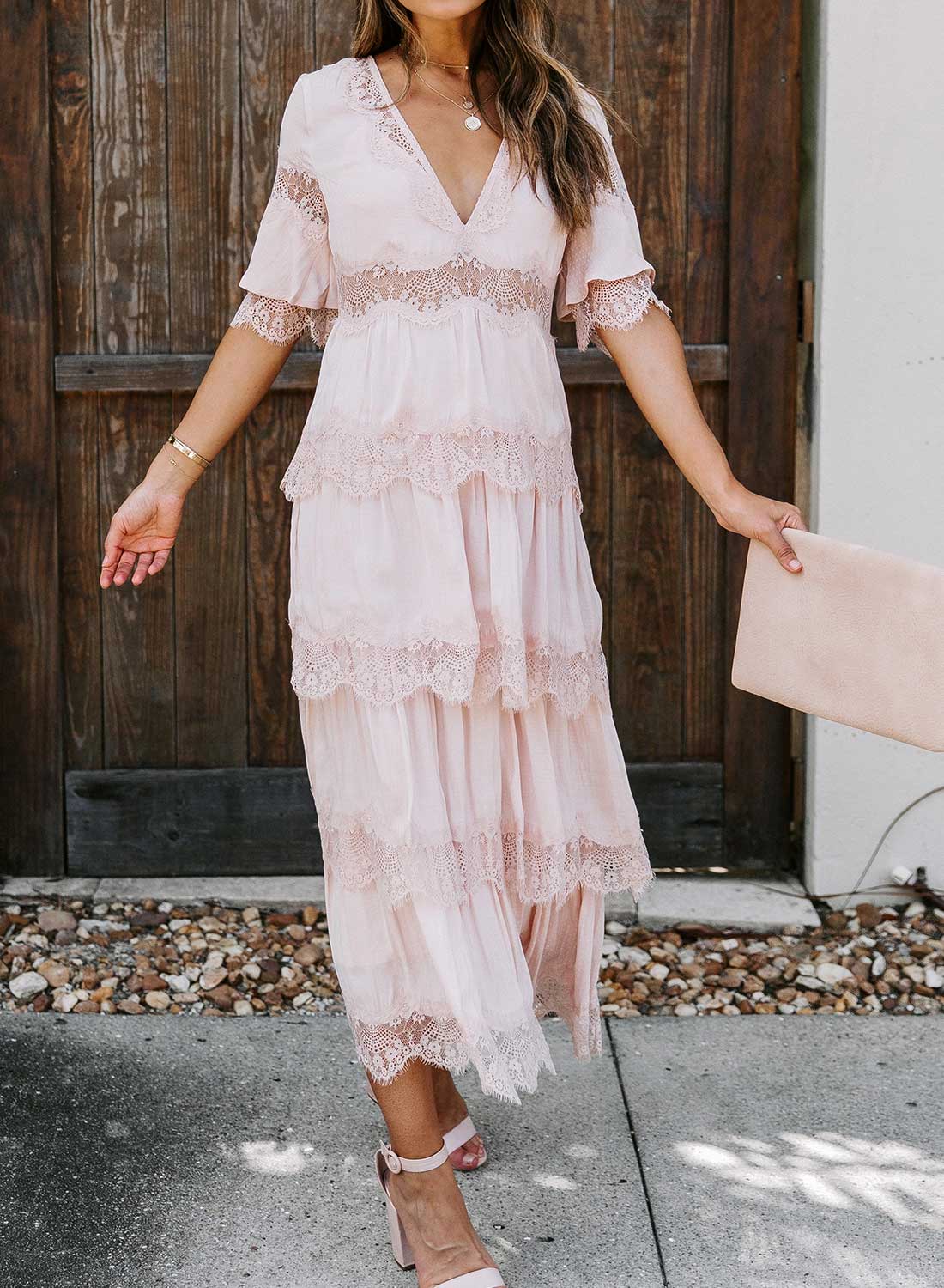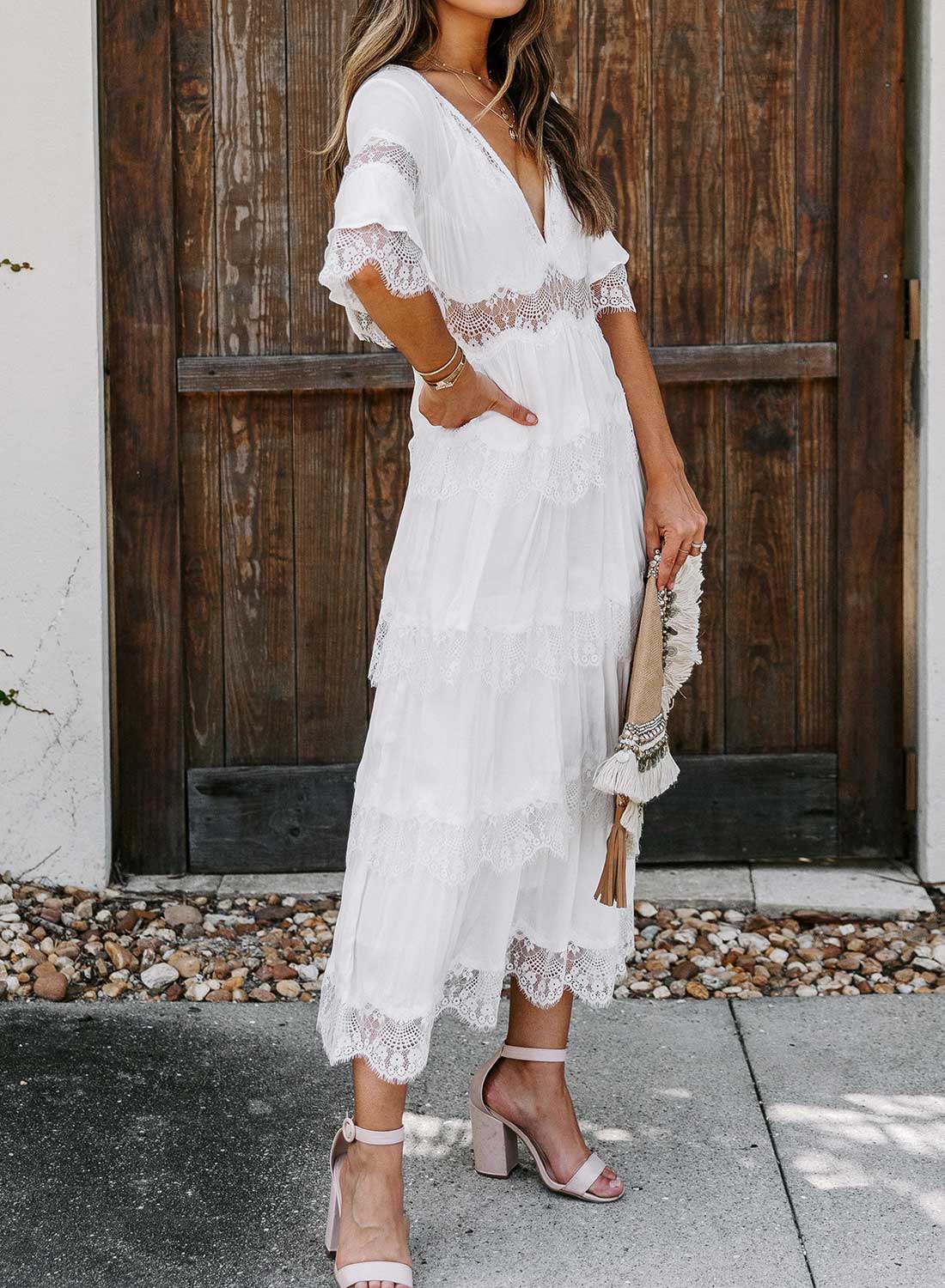 Short Sleeve V Neck Lace Maxi Dress