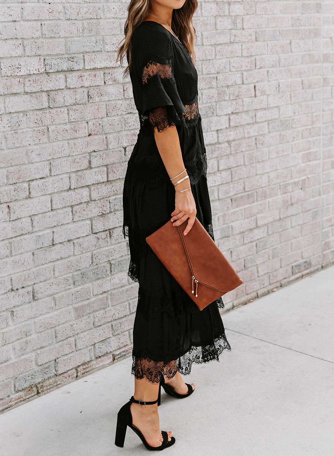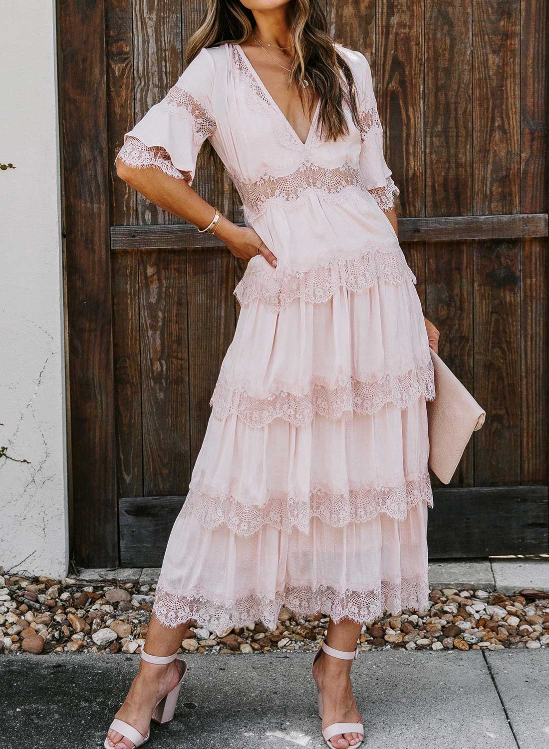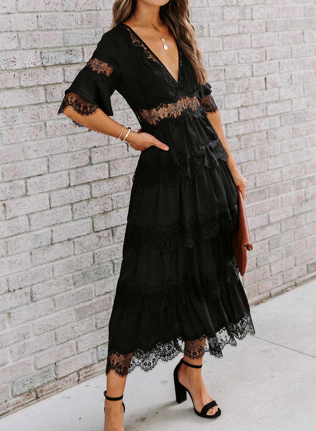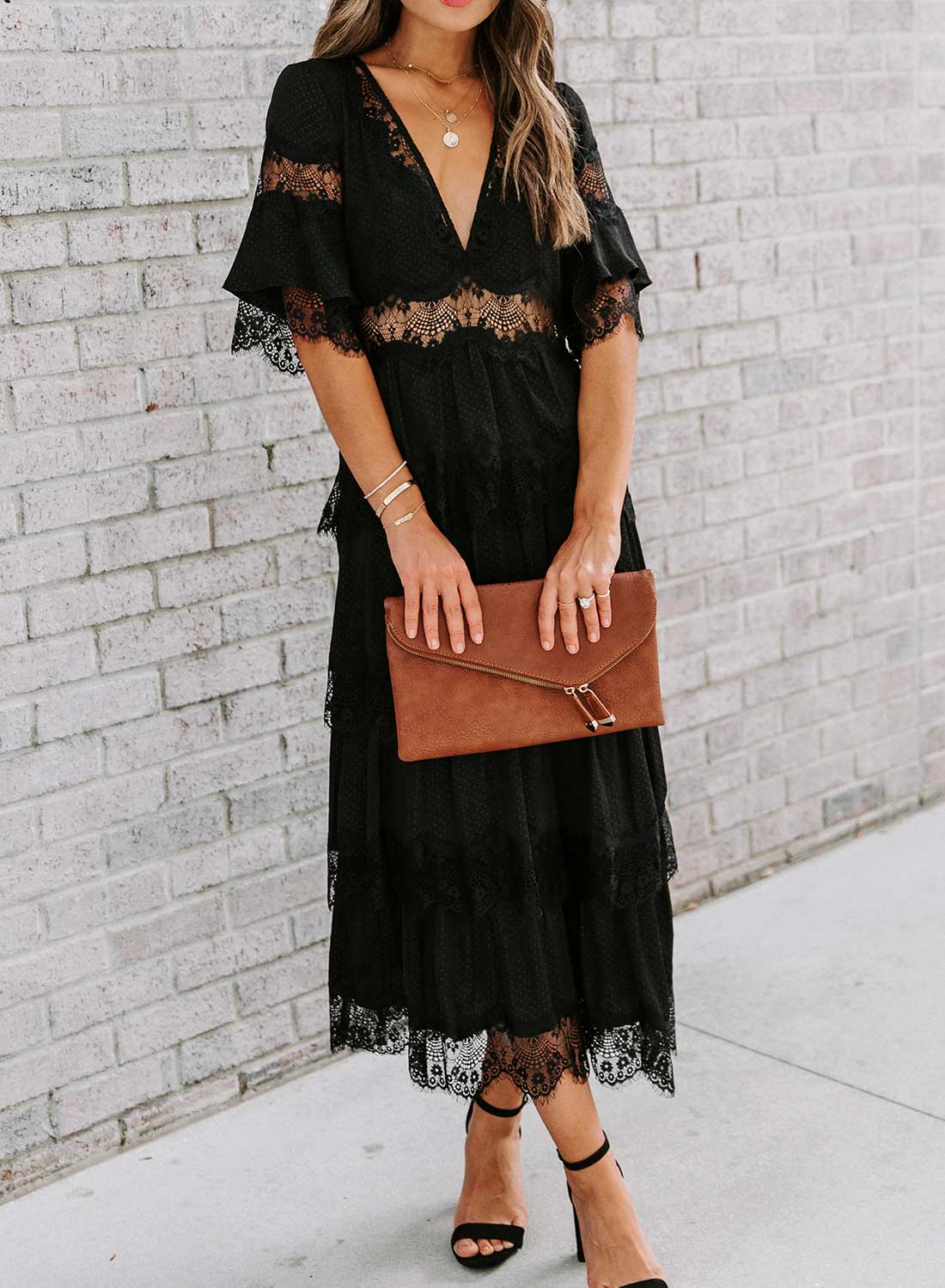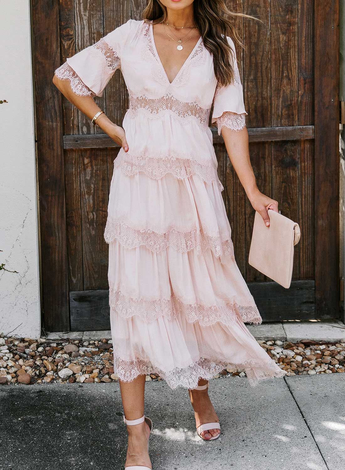 Short Sleeve V Neck Lace Maxi Dress