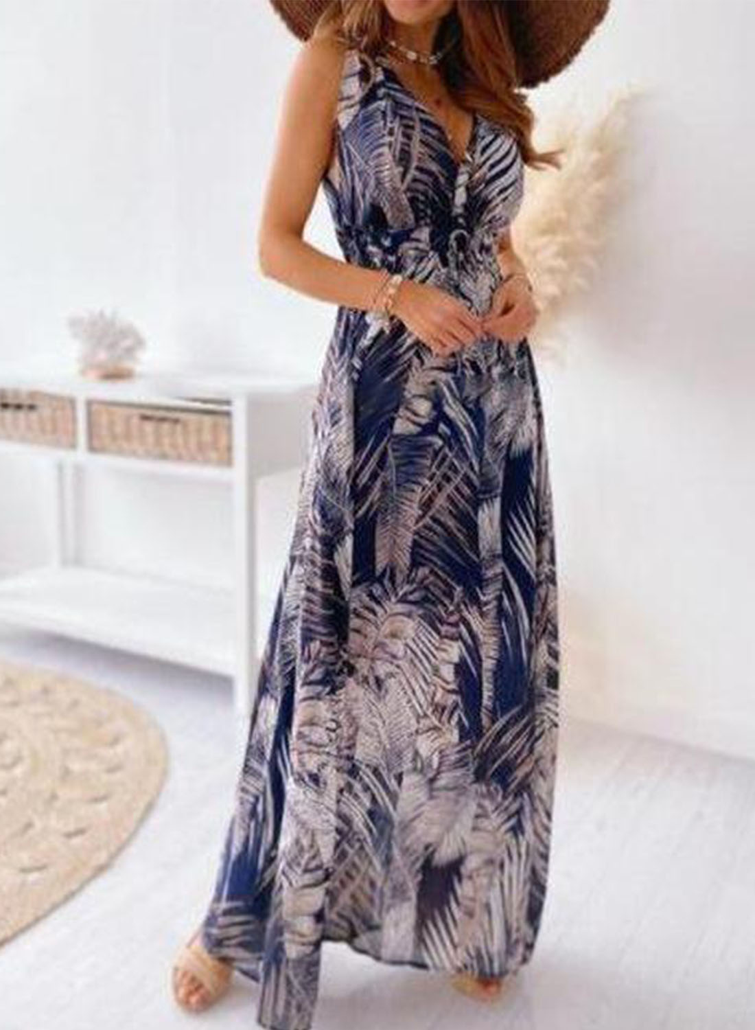 Women's Summer Maxi Dresses V-Neck Tropical Print Sexy Vacation Beach Sleeveless Dress