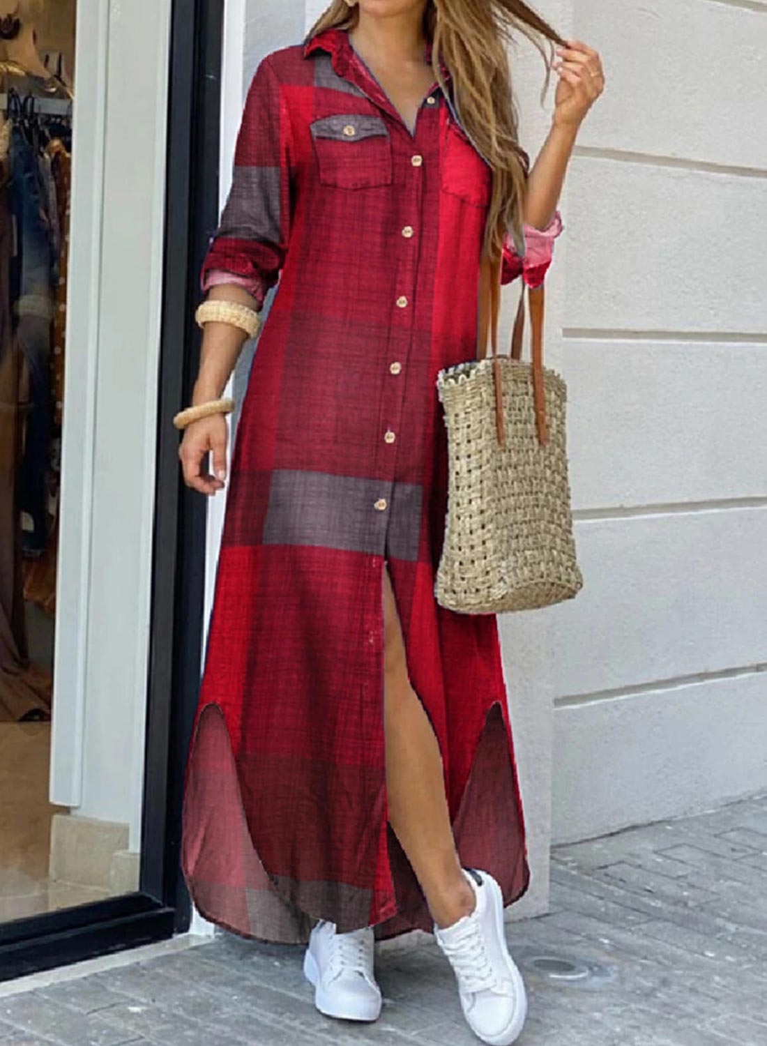 Women's Dress Casual Maxi Plaid Color Block Turn Down Collar Long Sleeve Maxi Shirt Dress