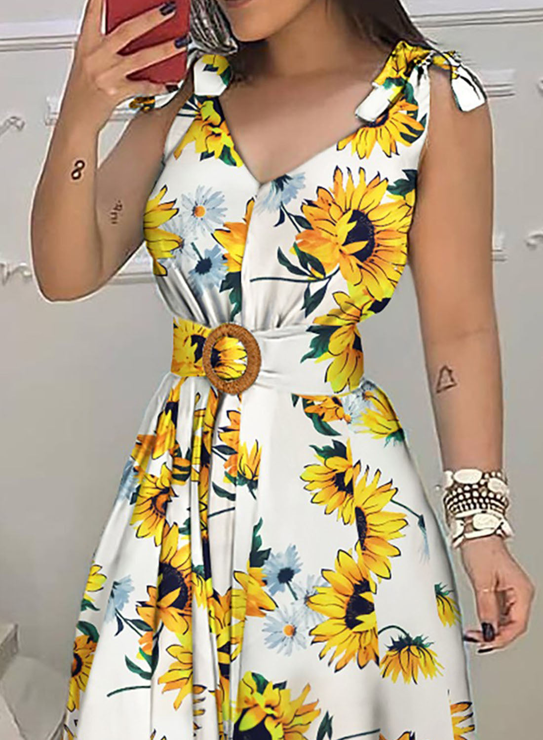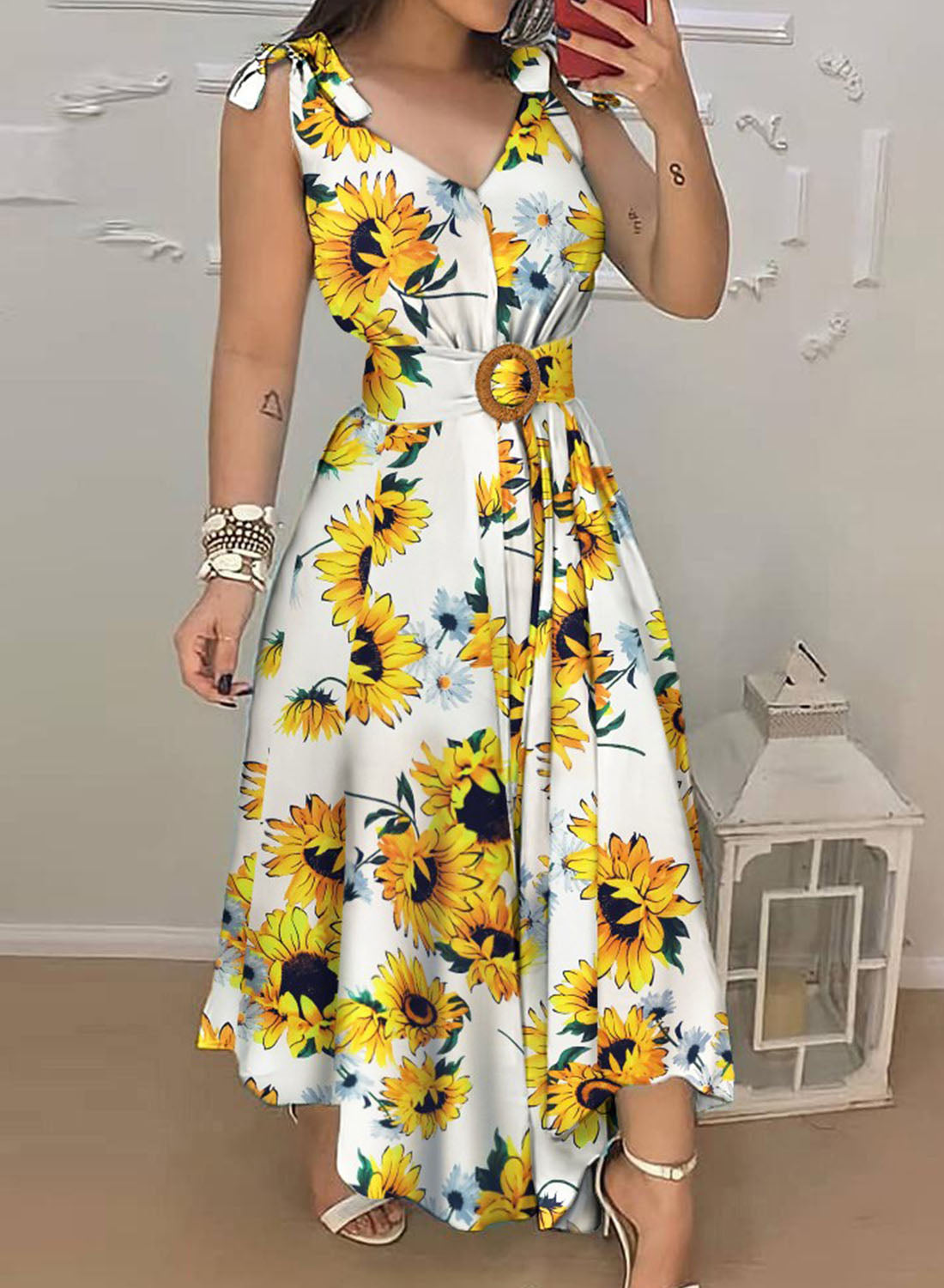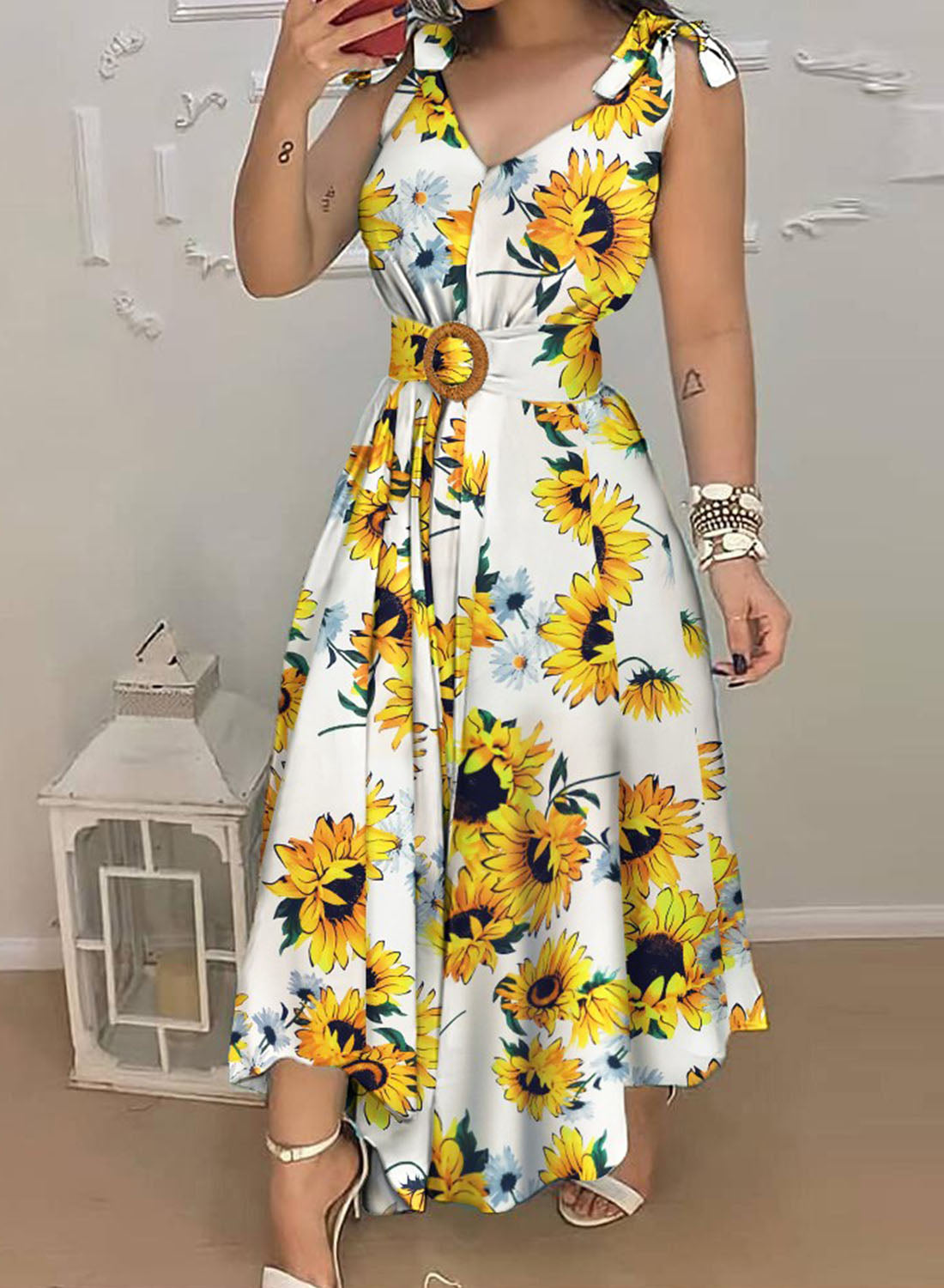 Women's Dress Sunflower Print Tie-shoulder Belted Maxi Dress