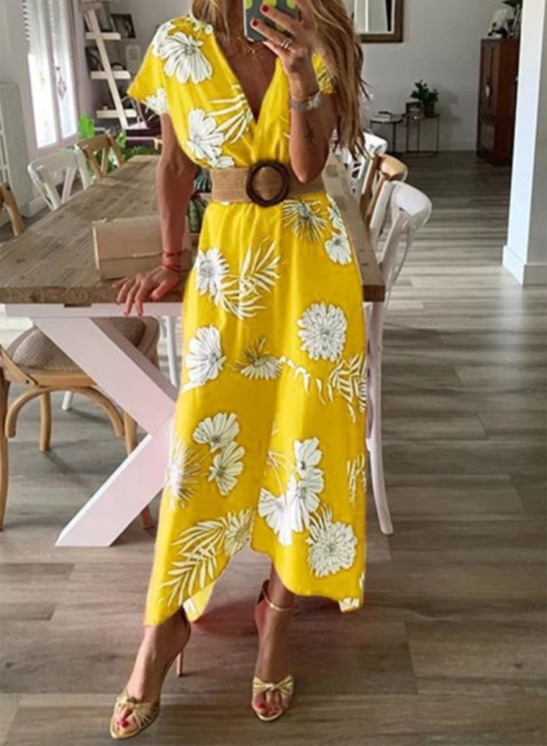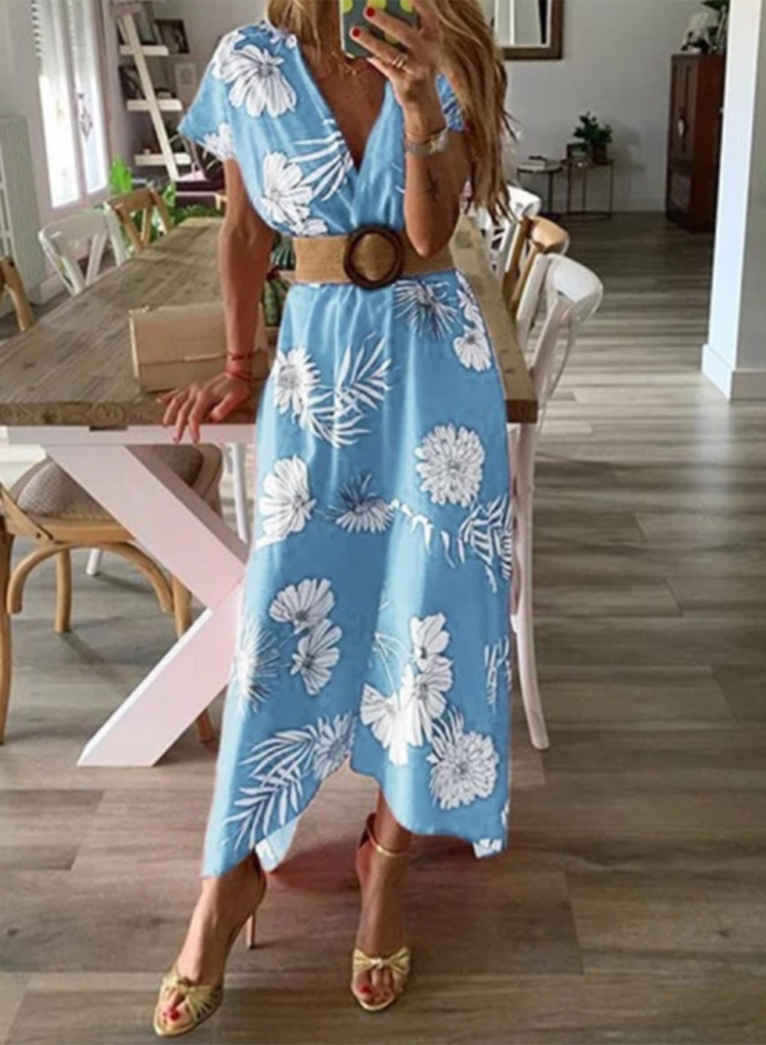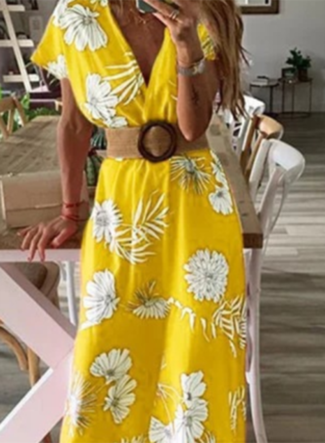 Women's Maxi Dresses A-line Floral Short Sleeve V Neck Vintage Boho Maxi Dress