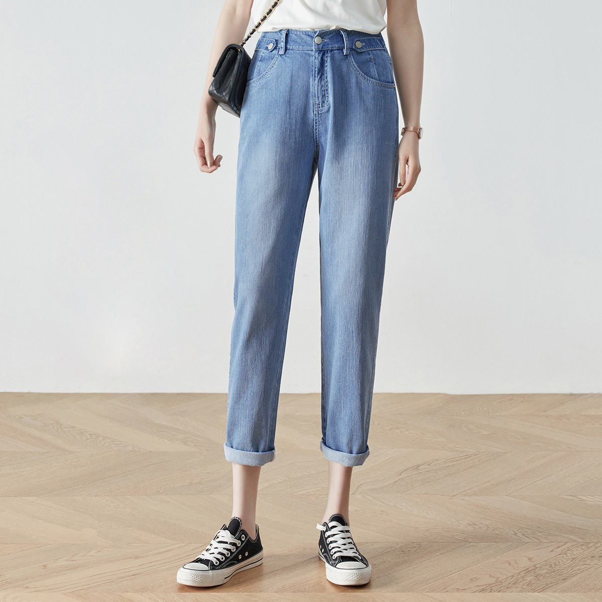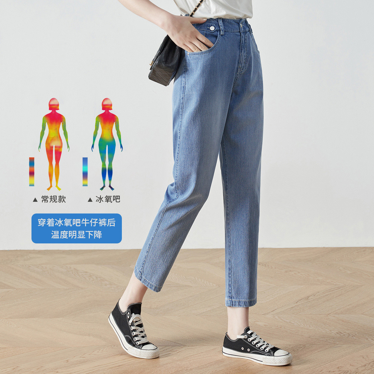 薄凉感冰丝裤女夏款高腰老爹牛仔裤女冰氧吧宽松九分哈伦裤子女
