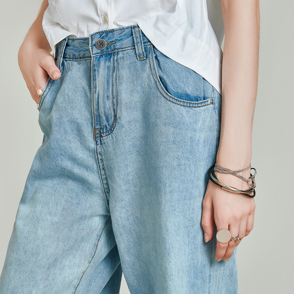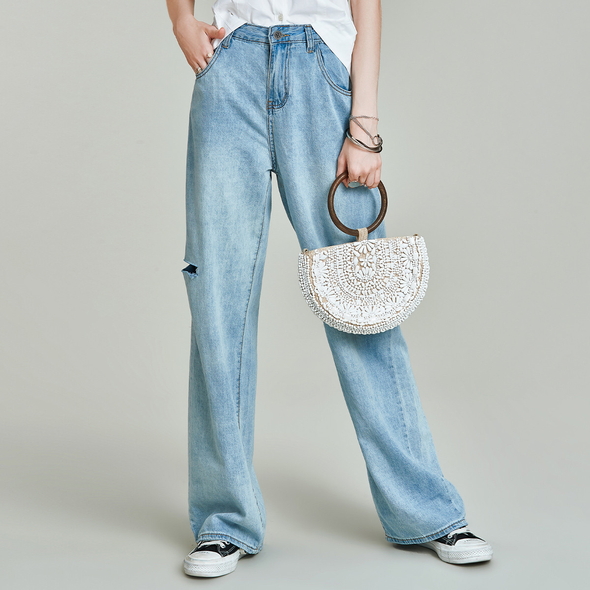 DENIM欧美精梳棉破洞加长阔腿女式牛仔老爹裤21秋新款